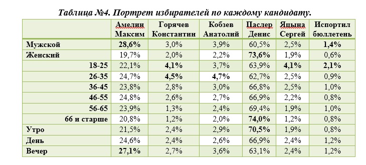 Если смотреть возрастную картину отдельно по кандидатам, то мы увидим, что избранный губернатор Денис Паслер имеет более пожилой электорат, а более молодой электорат у кандидатов К. Горячева и С. Яцыны. Также за Д. Паслера голосовали чаще женщины (73,6%), чем мужчины (60,5%), а за основного конкурента – М. Амелина, – напротив, чаще мужчины (28,6%), нежели женщины (19,7%).